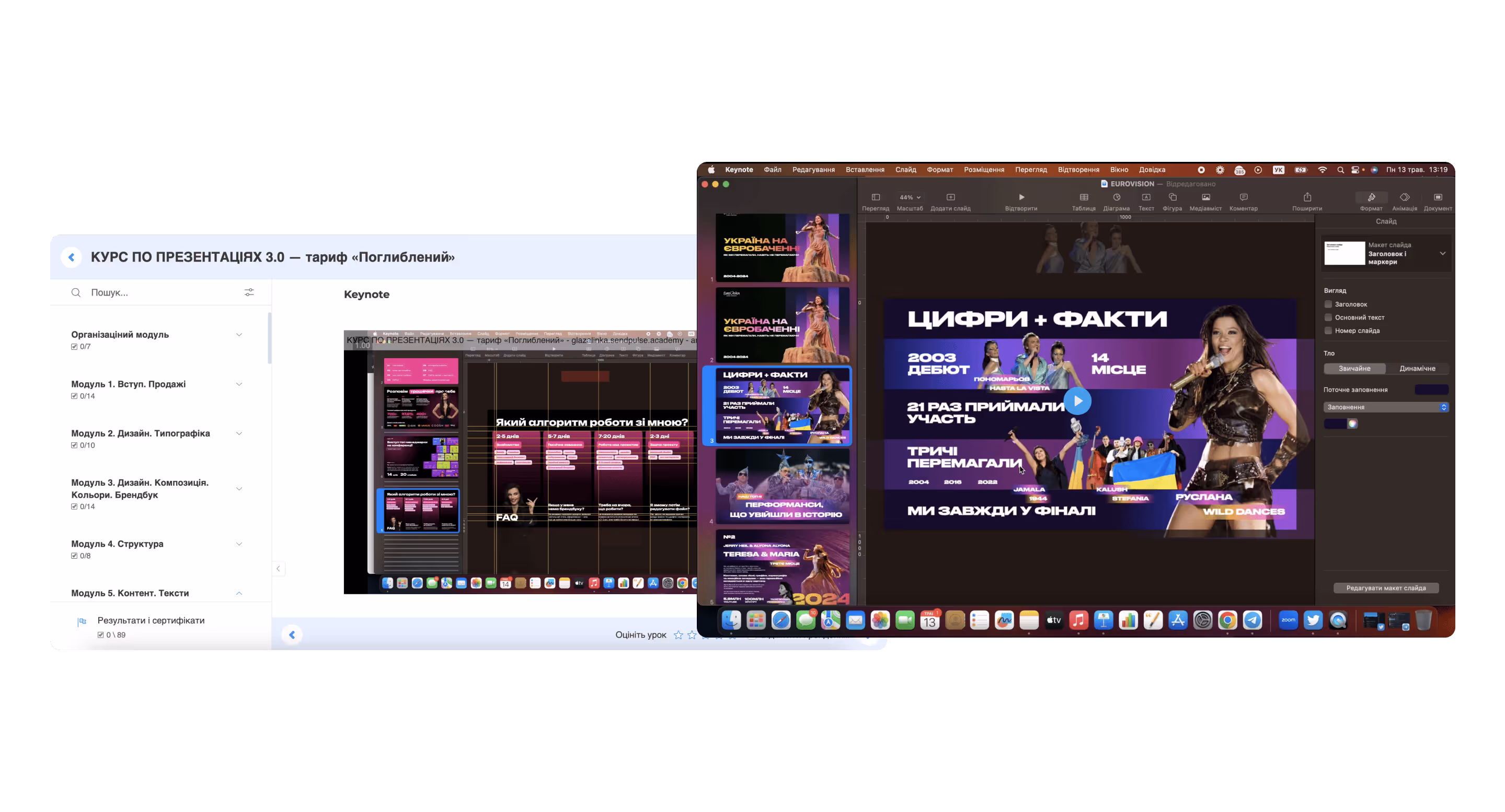 Туторіали записані і для Keynote (MacOs), i для PowerPoint (Windows). Але крім “тицяння” на кнопки, у туторіалах є інформація, універсальна для будь-якої програми. Наприклад, блоки про роботу з контентом та технічні навички. Вони значно пришвидшать роботу над прєзами. До речі, студенти перших двох потоків працювали і в Canva, і у Figma.